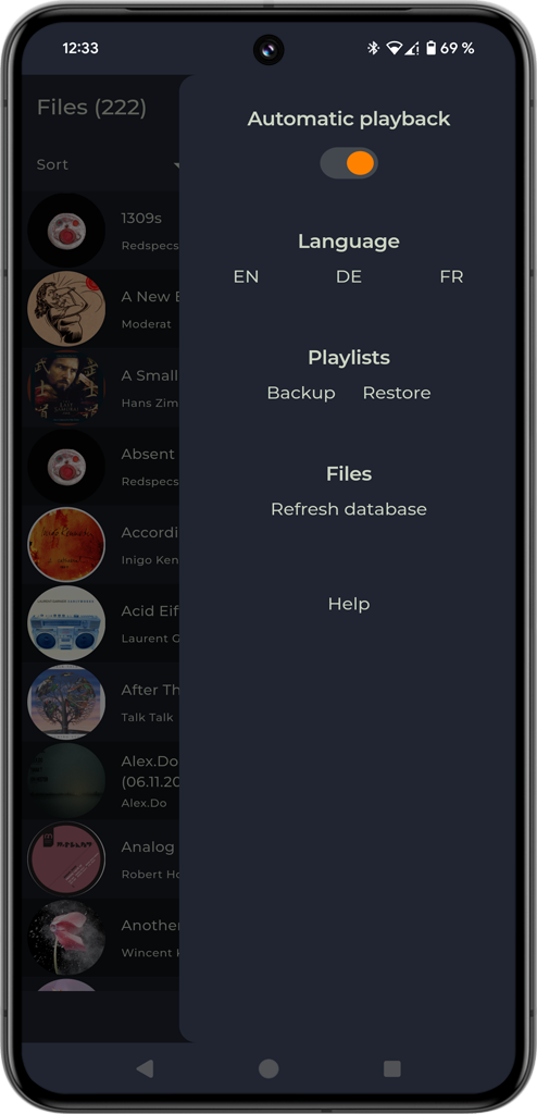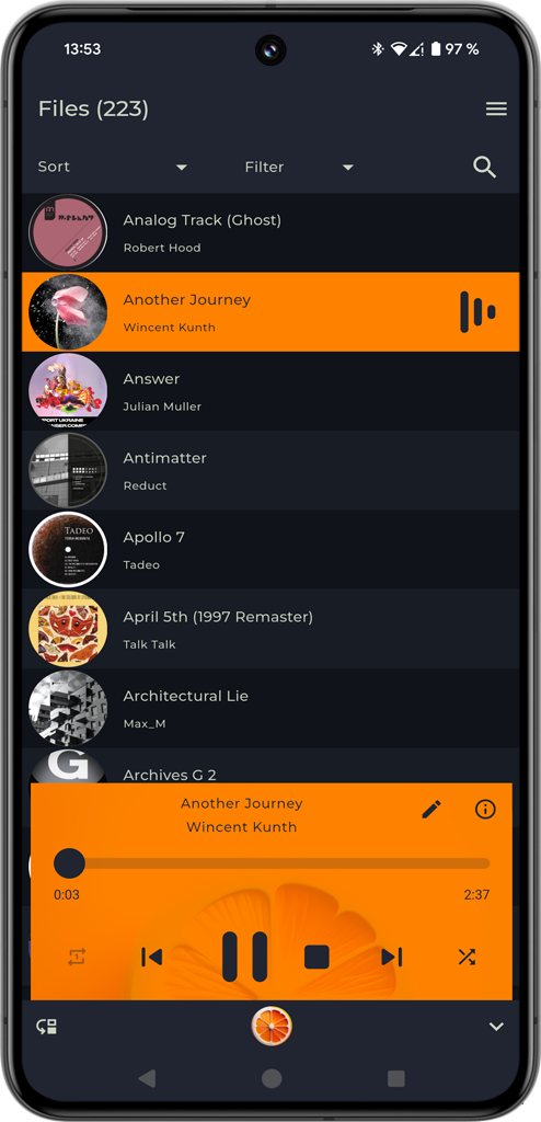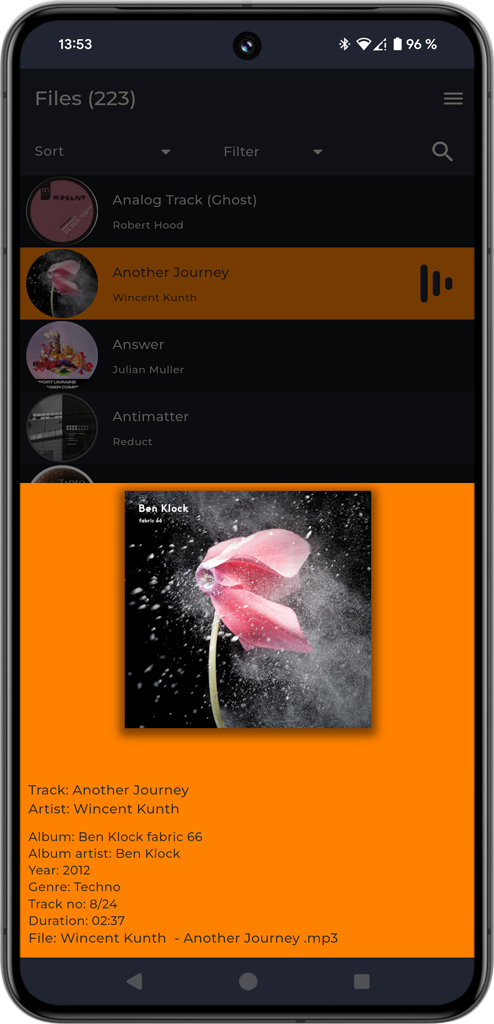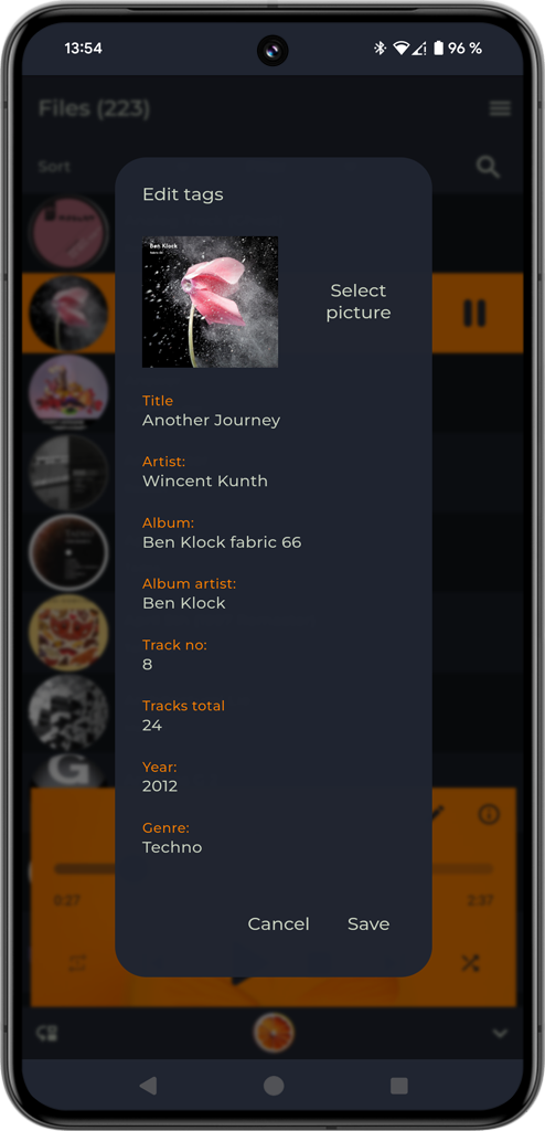 Music player with playlist manager and tag editor Dependency injection (GetIt), Notifications, Audio session for passing playback to/from other apps, Media Store for writing files in media library (as per recent Google requirements), Google authentication, Localization Data persistence: ObjectBox, Shared Preferences Clean architecture State management: Bloc/Cubit |